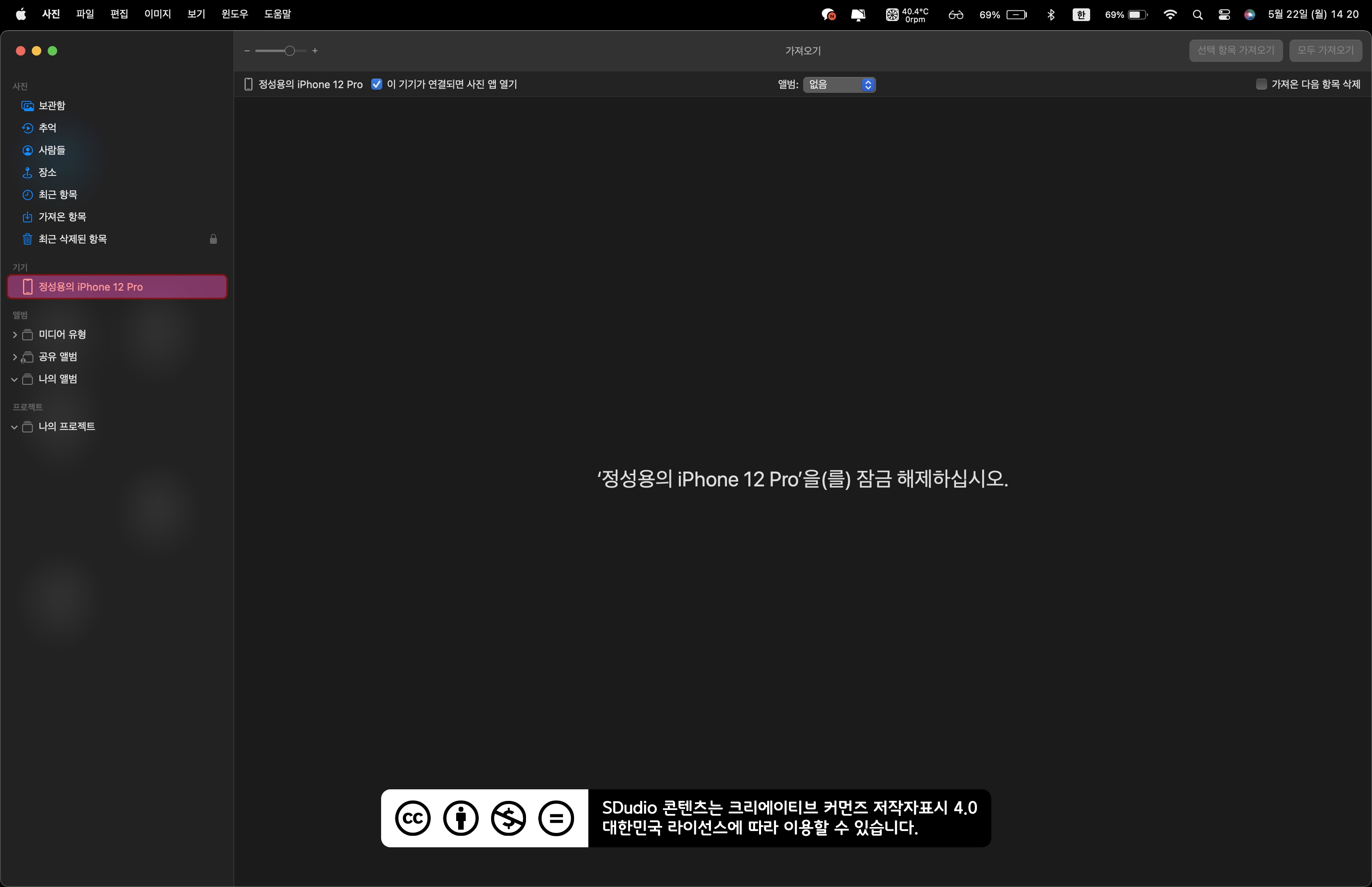 맥에서 사진앱을 실행하고, 맥과 아이폰을 연결합니다.
